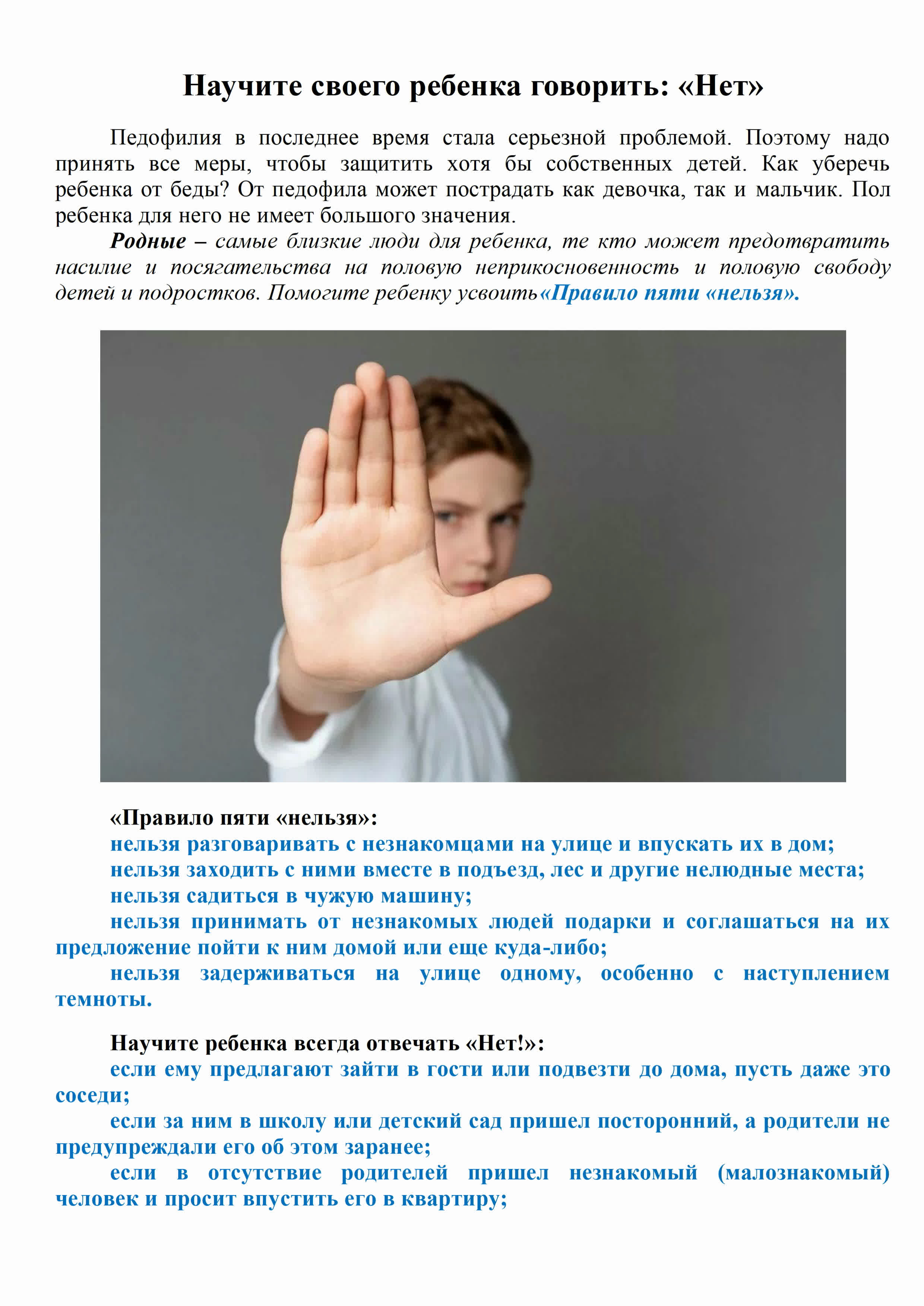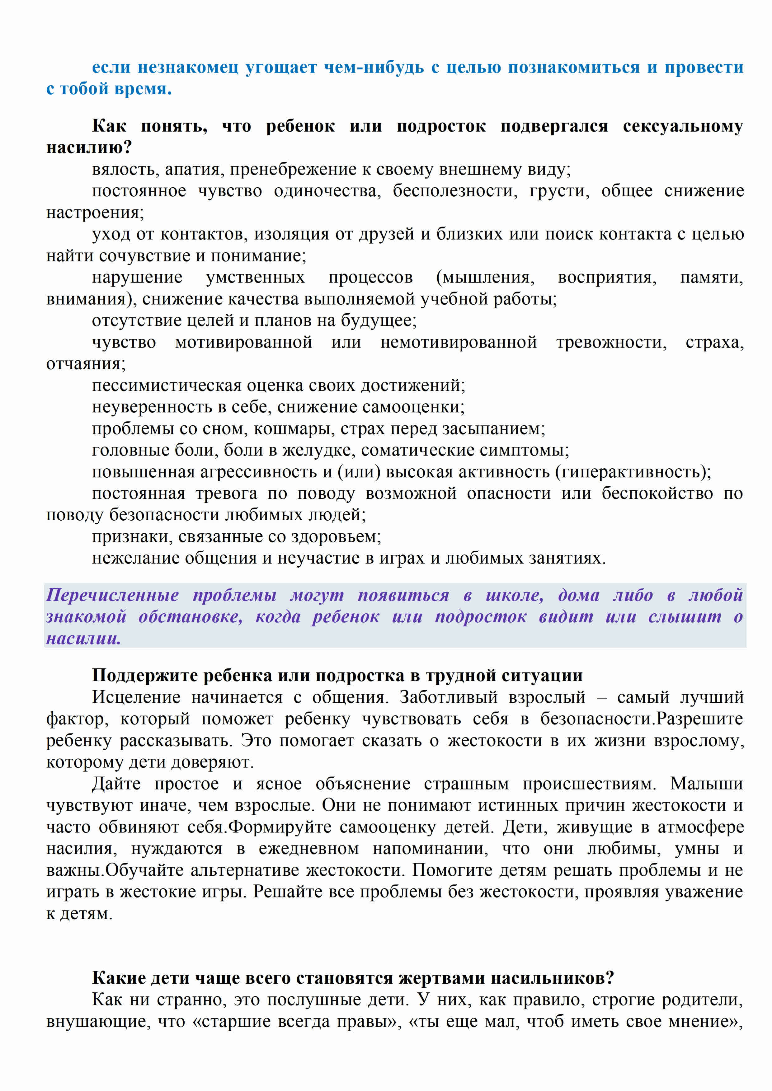 Если вы заметили странность в поведении ребенка, поговорите с ним о том, что его беспокоит. Поддерживайте контакт с воспитателем детского сада, учителем, психологом в детских учреждениях с целью предотвращения совершения насильственных преступлений в отношении ребенка.