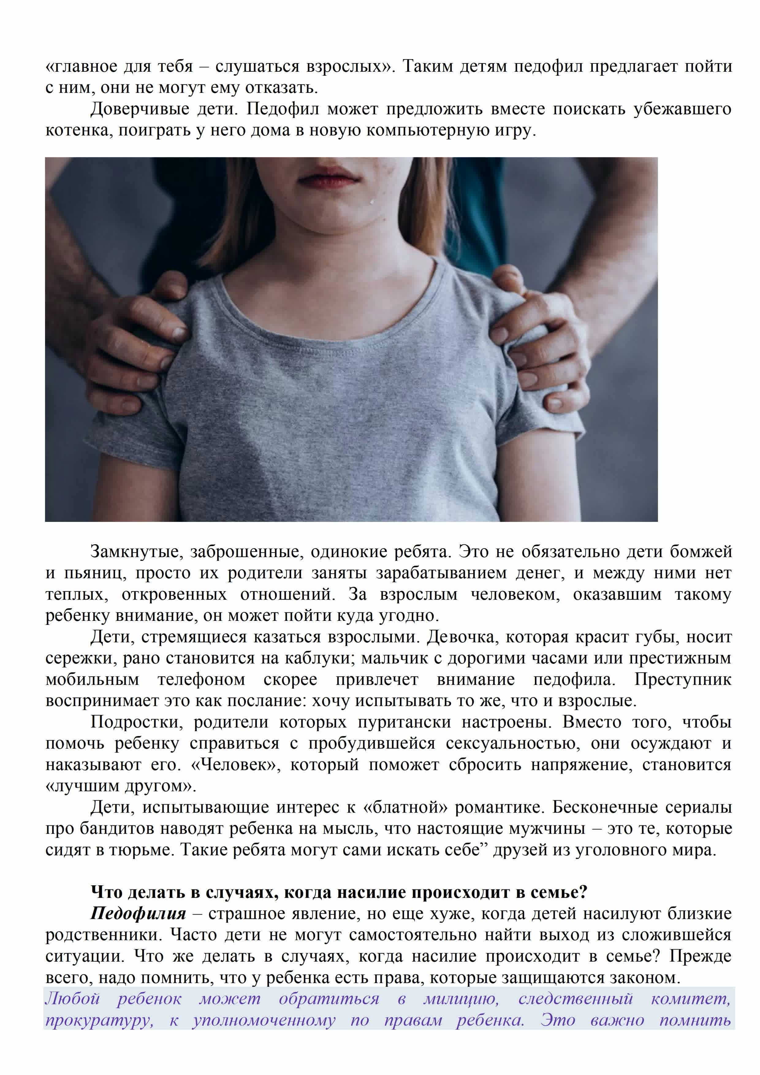 Что же делать в случаях, когда насилие происходит в семье? Прежде всего – помнить, что у ребенка есть права, которые защищаются законом. Любой ребенок может обратиться в милицию, Следственный комитет, прокуратуру. По закону дело об изнасиловании несовершеннолетнего может быть возбуждено и без заявления, если об этом факте стало известно из других источников.