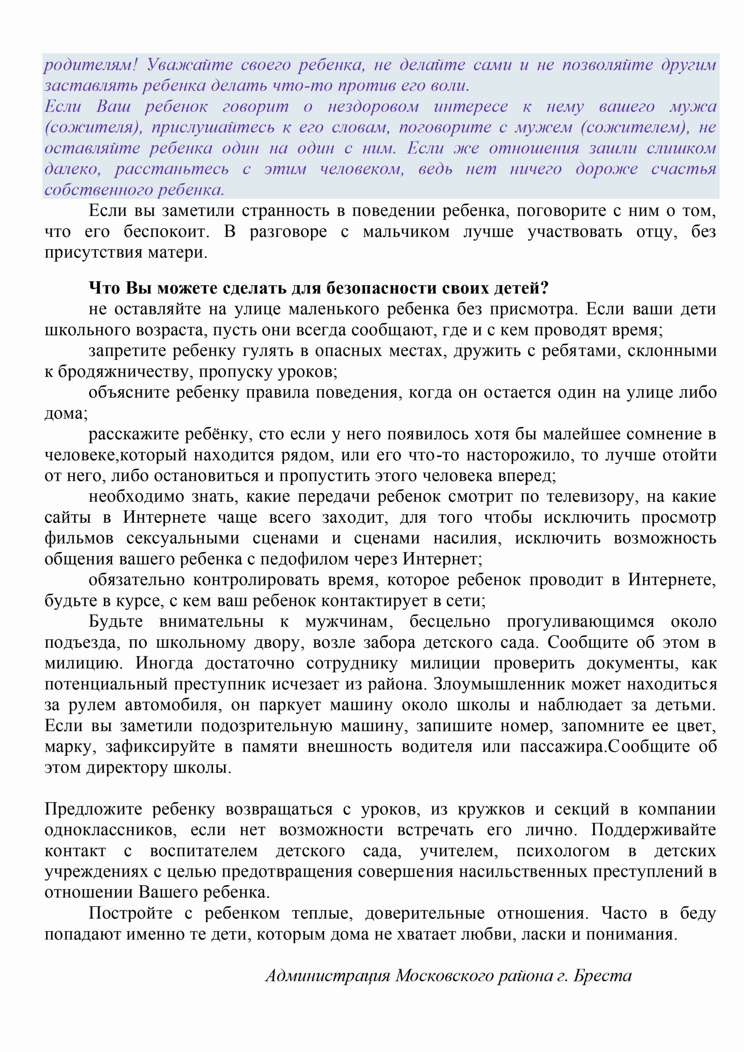 Если Вы располагаете информацией о фактах насильственных действий сексуального характера в отношении несовершеннолетних, вы можете на конфиденциальной и (или) анонимной основе сообщить указанные сведения в отделение по наркоконтролю и противодействию торговле людьми криминальной милиции УВД администрации Московского района г.Бреста по телефону 40 89 69 либо по телефону 102.