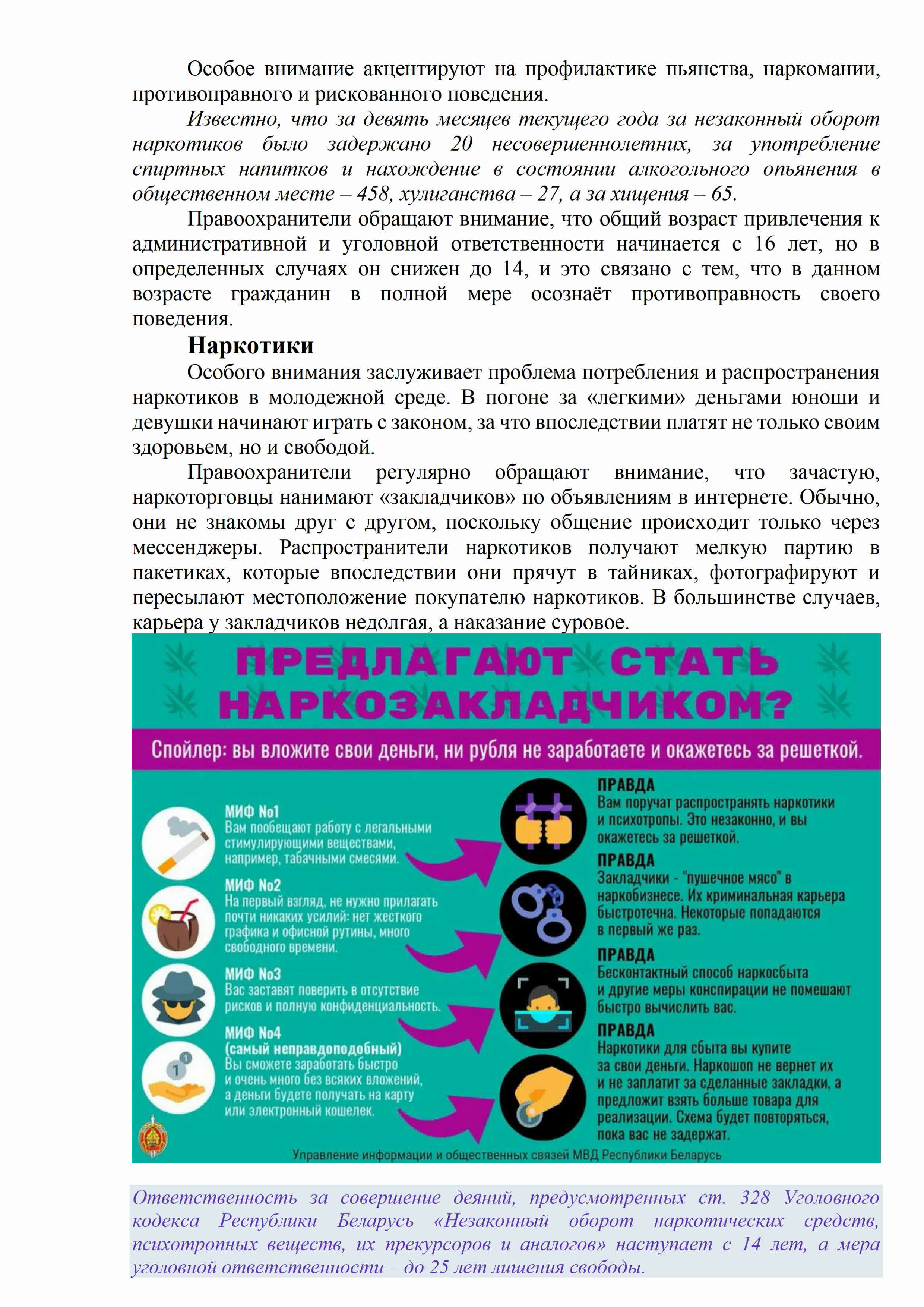 Если после задержания «трафаретчика» выяснится, что он причастен к распространению наркотиков, его действия будут квалифицированы по соответствующей части ст. 328 УК Республики Беларусь («незаконный оборот наркотических средств, психотропных веществ, их прекурсоров и аналогов»).