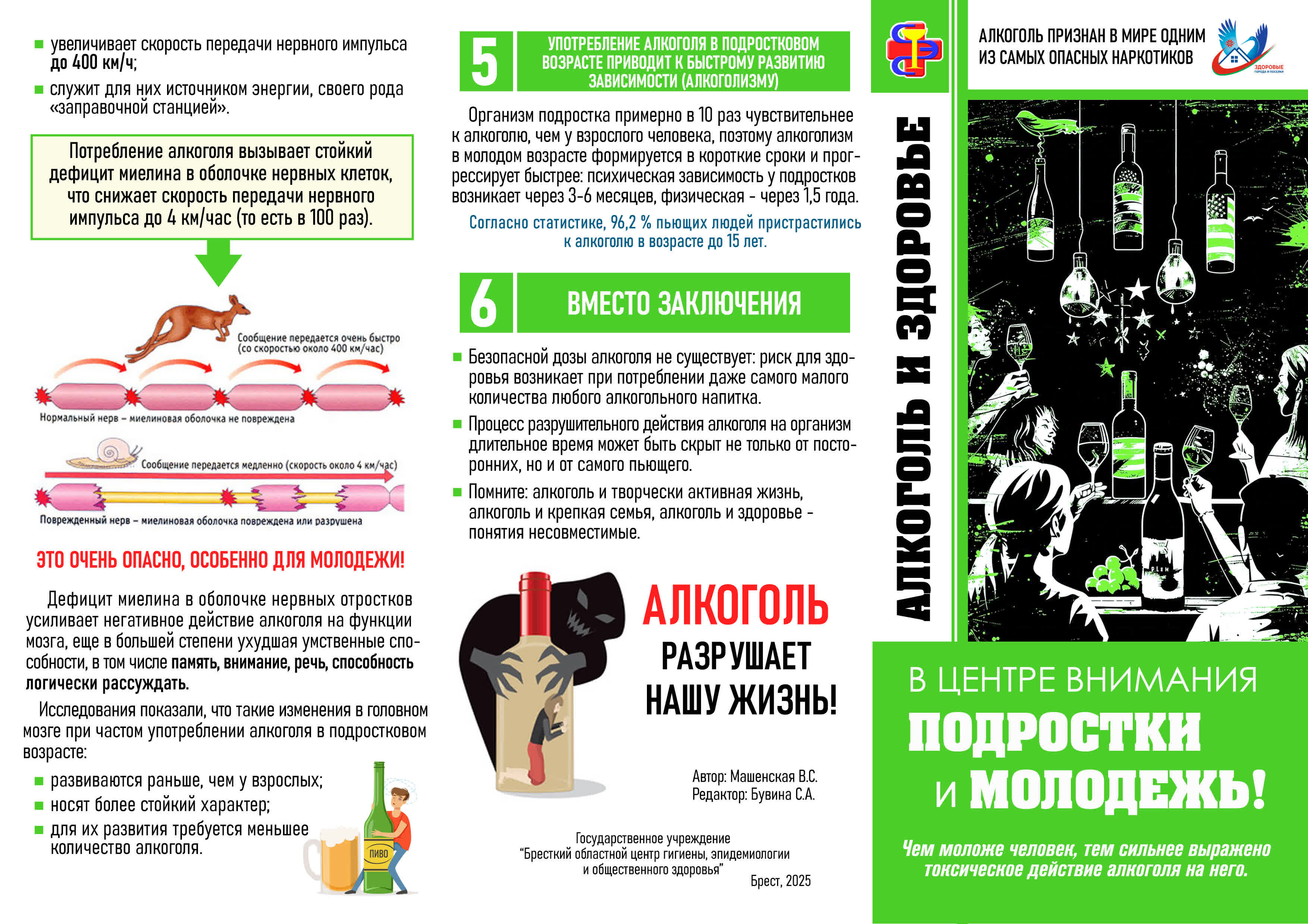 Особенно опасен алкоголь для подростков и молодежи. Мозговая ткань человека формируется полностью к 21 году. Раннее приобщение к алкоголю наносит огромный вред нервной системе, иногда непоправимый.