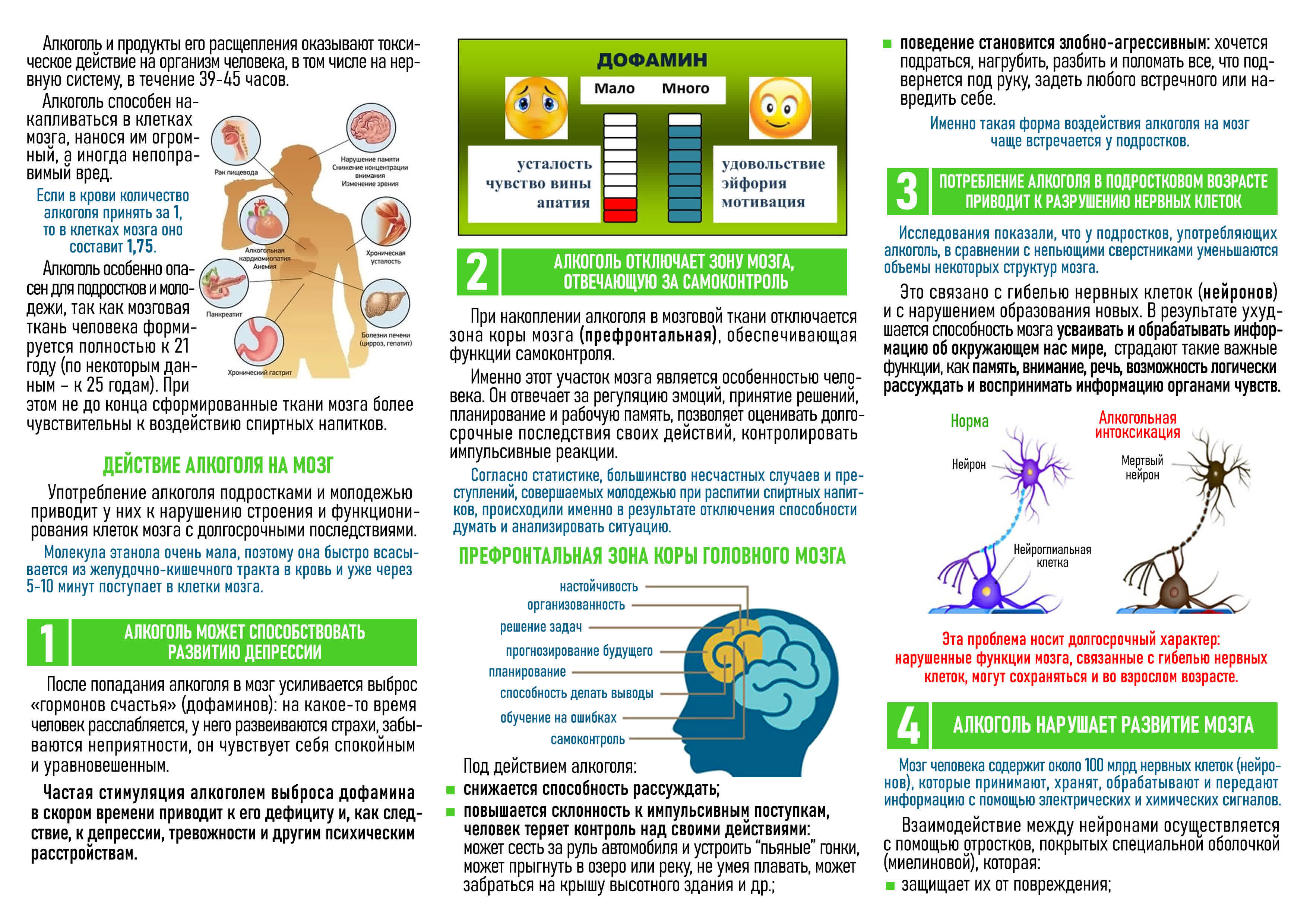 При накоплении алкоголя в мозговой ткани отключается та зона коры головного мозга (префронтальная), которая отвечает за самоконтроль, настойчивость и организованность, за прогнозирование будущего и решение задач, за умение делать выводы.